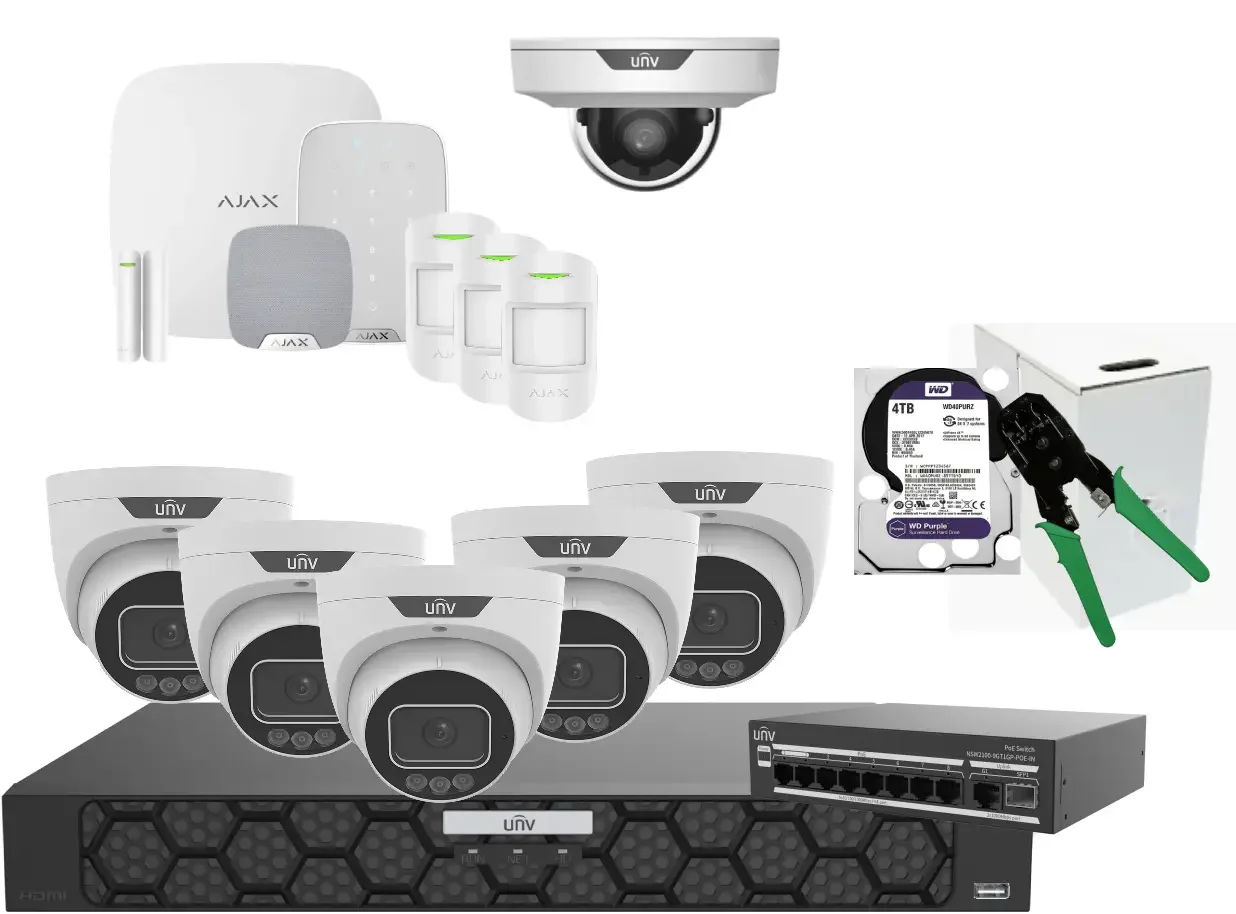 Løsningen kombinerer professionel NVR, PTZ-overvågning, faste kameraer, PoE-switch, struktureret netværk samt et fuldt Ajax-alarmsystem. Alt er udvalgt til stabil drift, nem udvidelse og lang levetid.