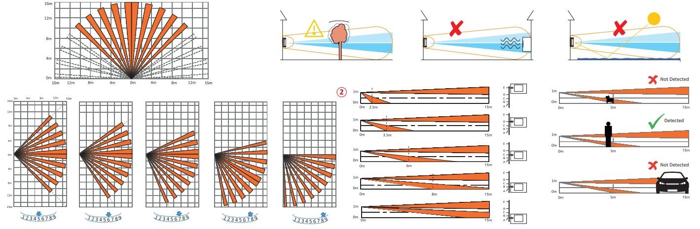 Monteringshøjde er 1 meter, da hver af de 2 PIR skyder henholdsvis op og ned. Dette er også med til at sikre, at detektoren ikke reagere på mindre dyr.