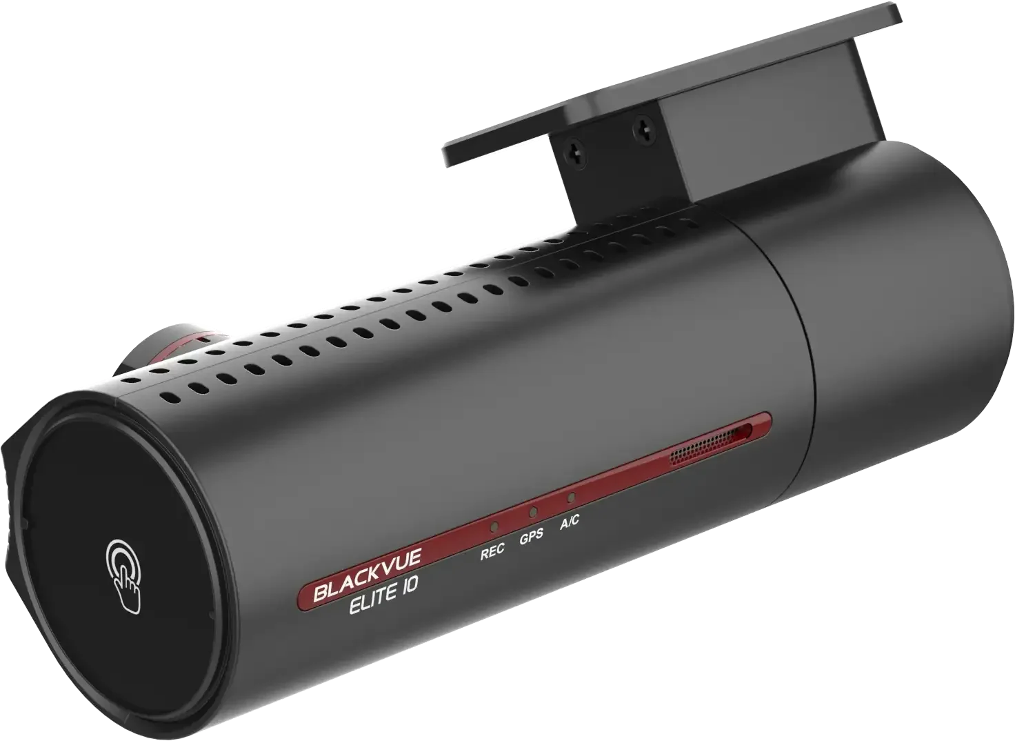 The camera features a touch sensor that lets you quickly start a manual recording if you see something you want to save right away. There is also a power button and LED indicators that show recording, GPS and cloud status.