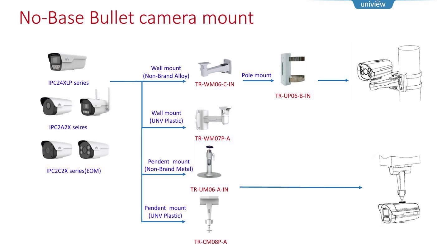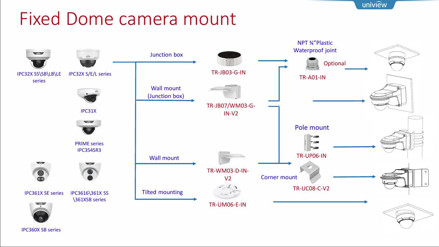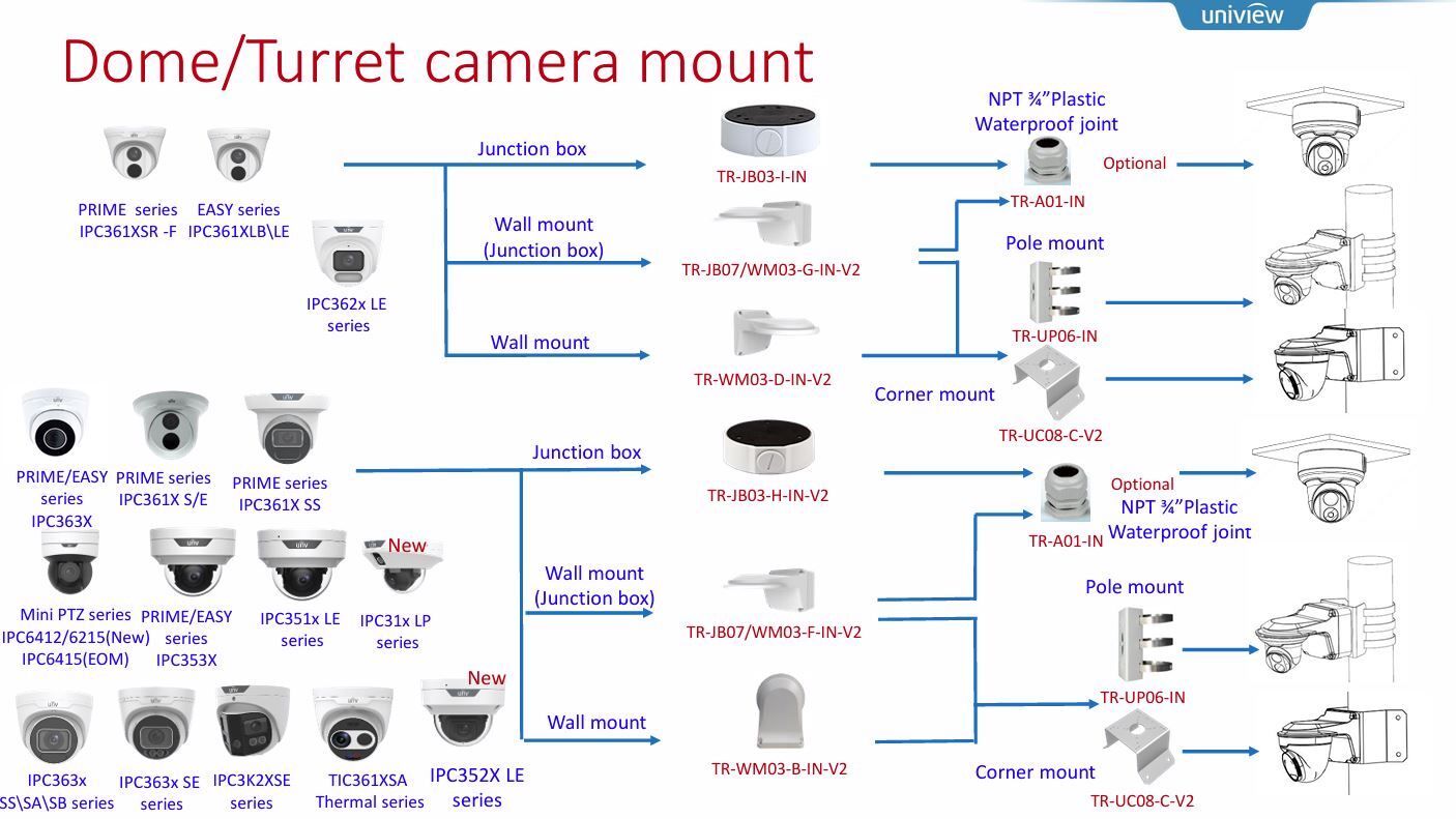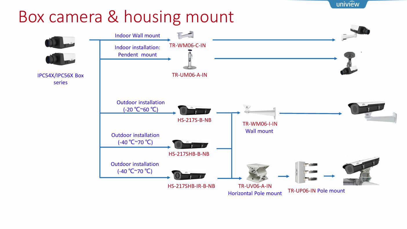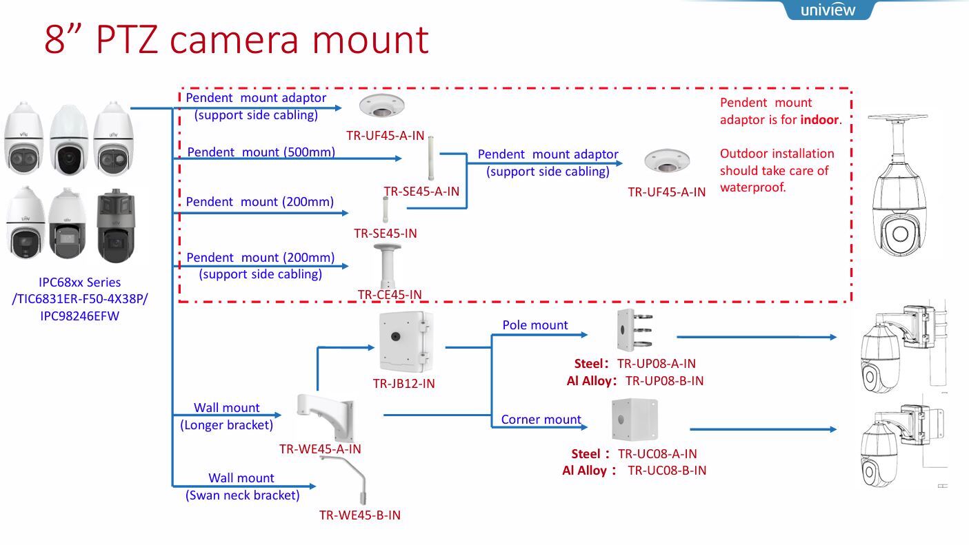 Skal du bruge beslag eller adapter til et Uniview kamera, så kan du bruge denne guide, men husk også at du kan finde alle de beslag der passer til kameraet, ved at gå til produktets side og vælge fanen .PDF og så downloade datasheet, her står det på sidste side ????