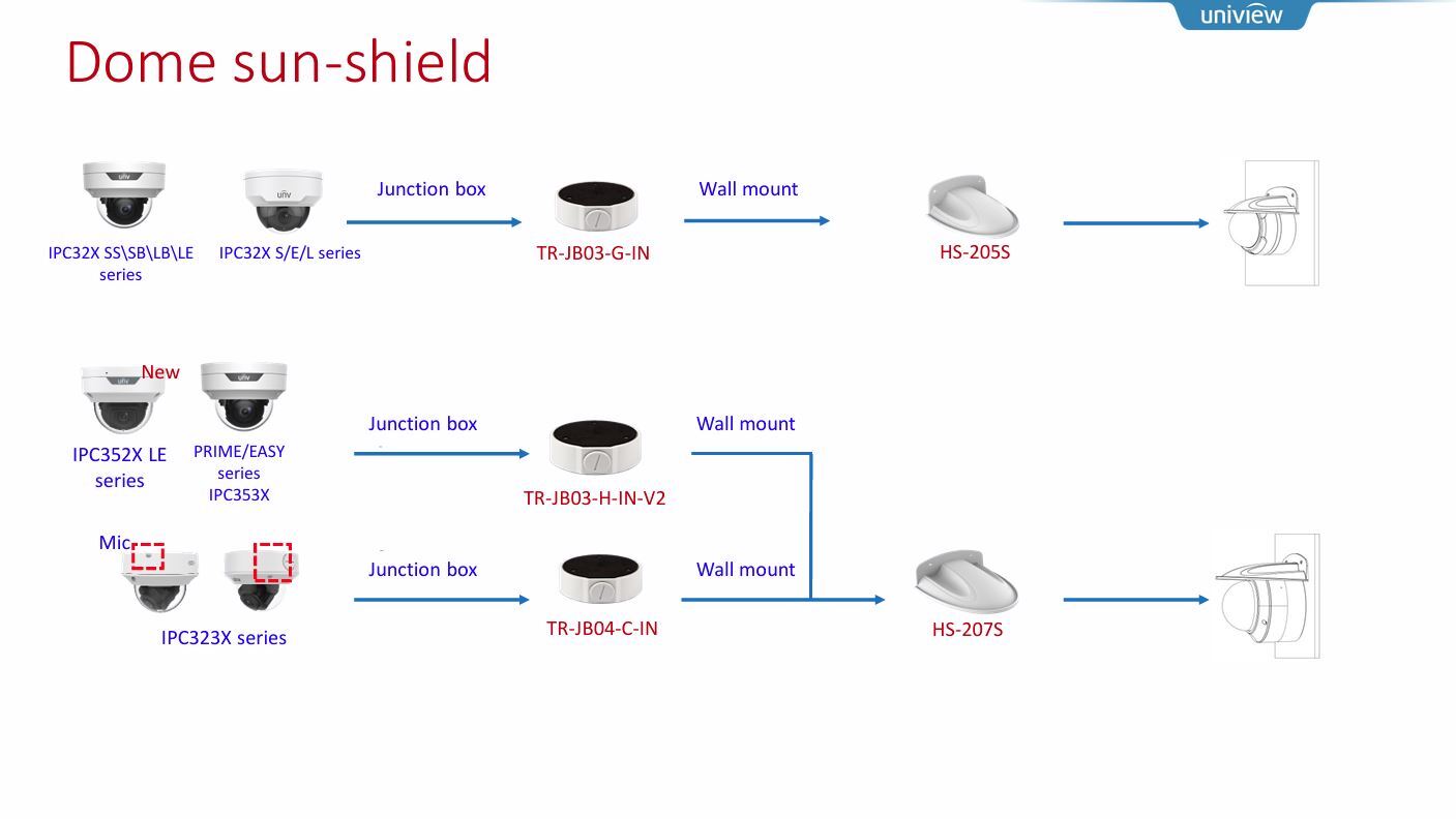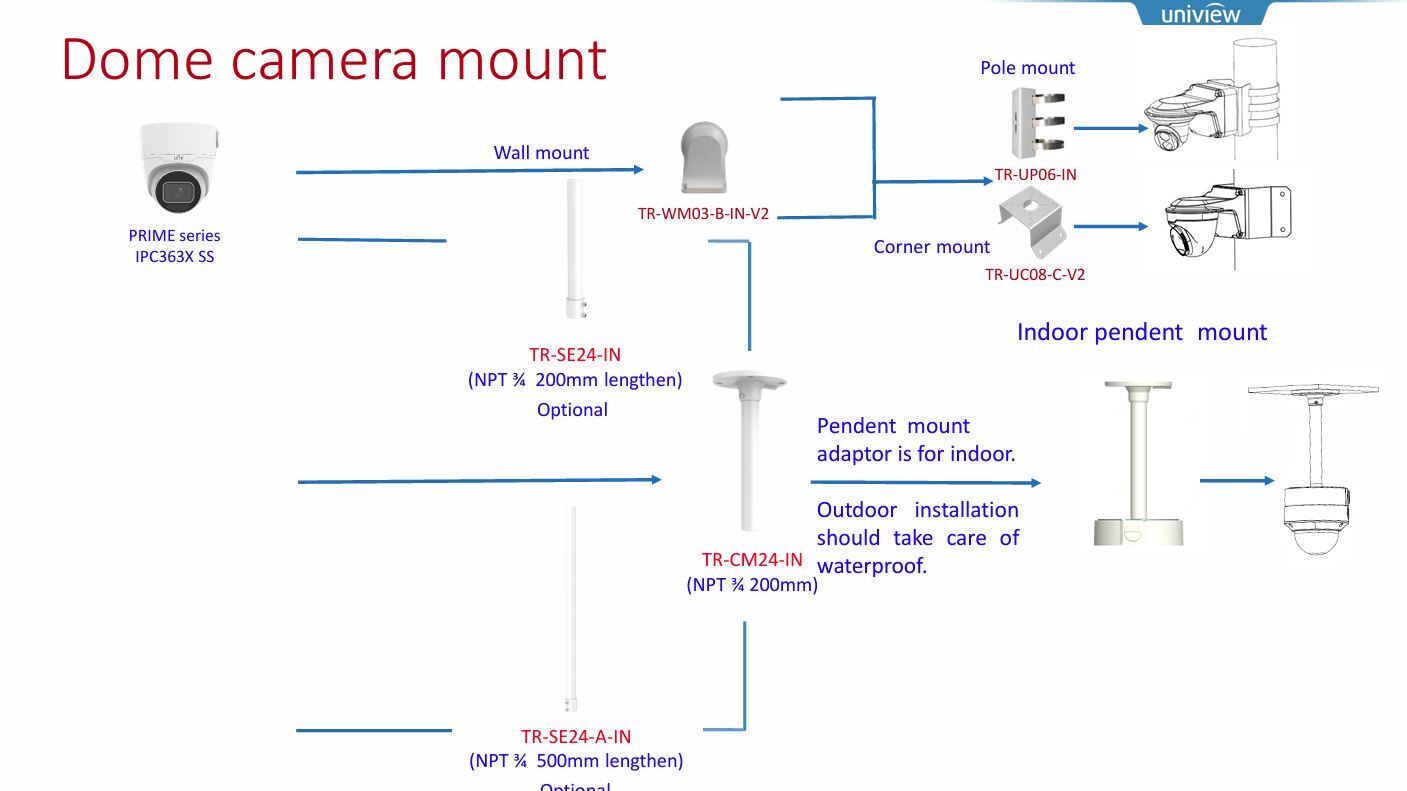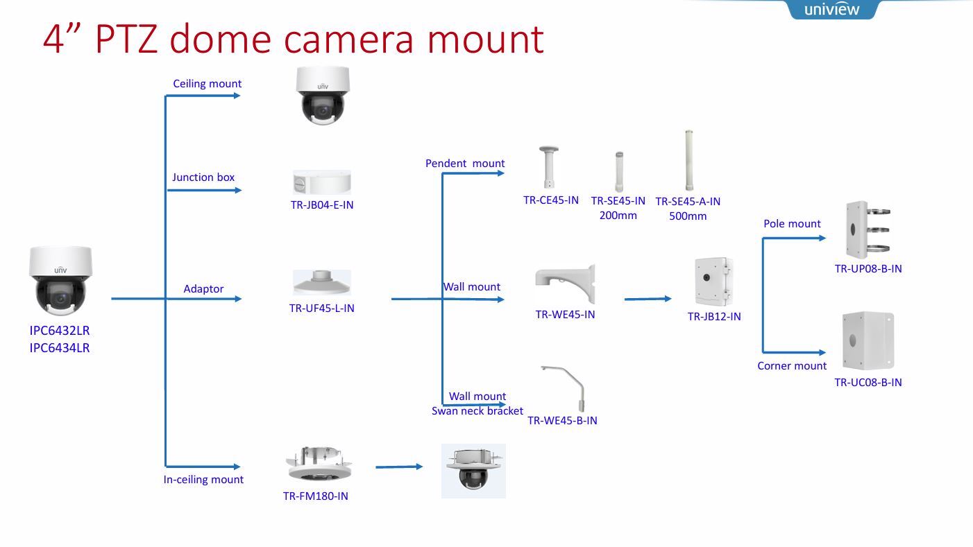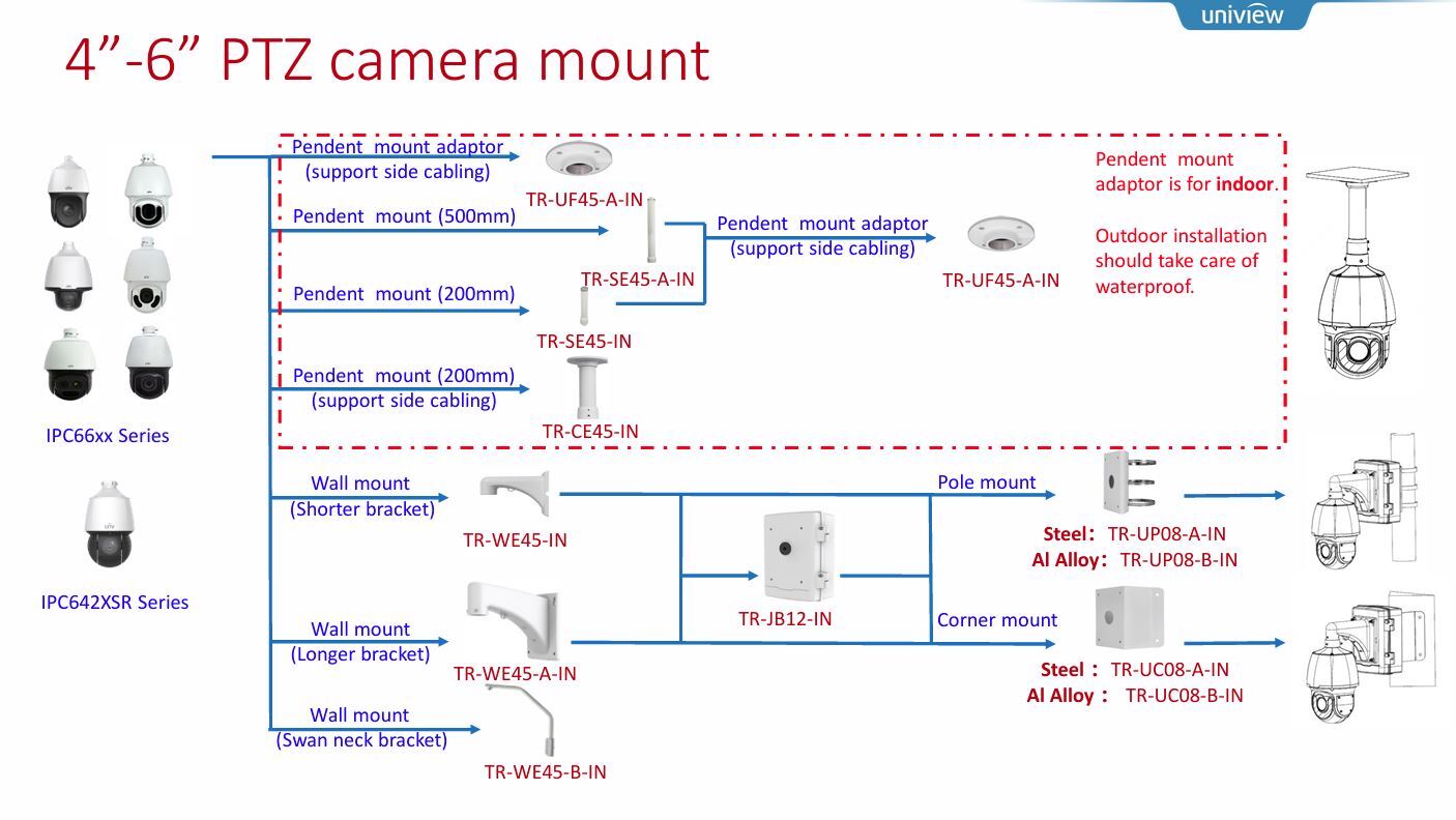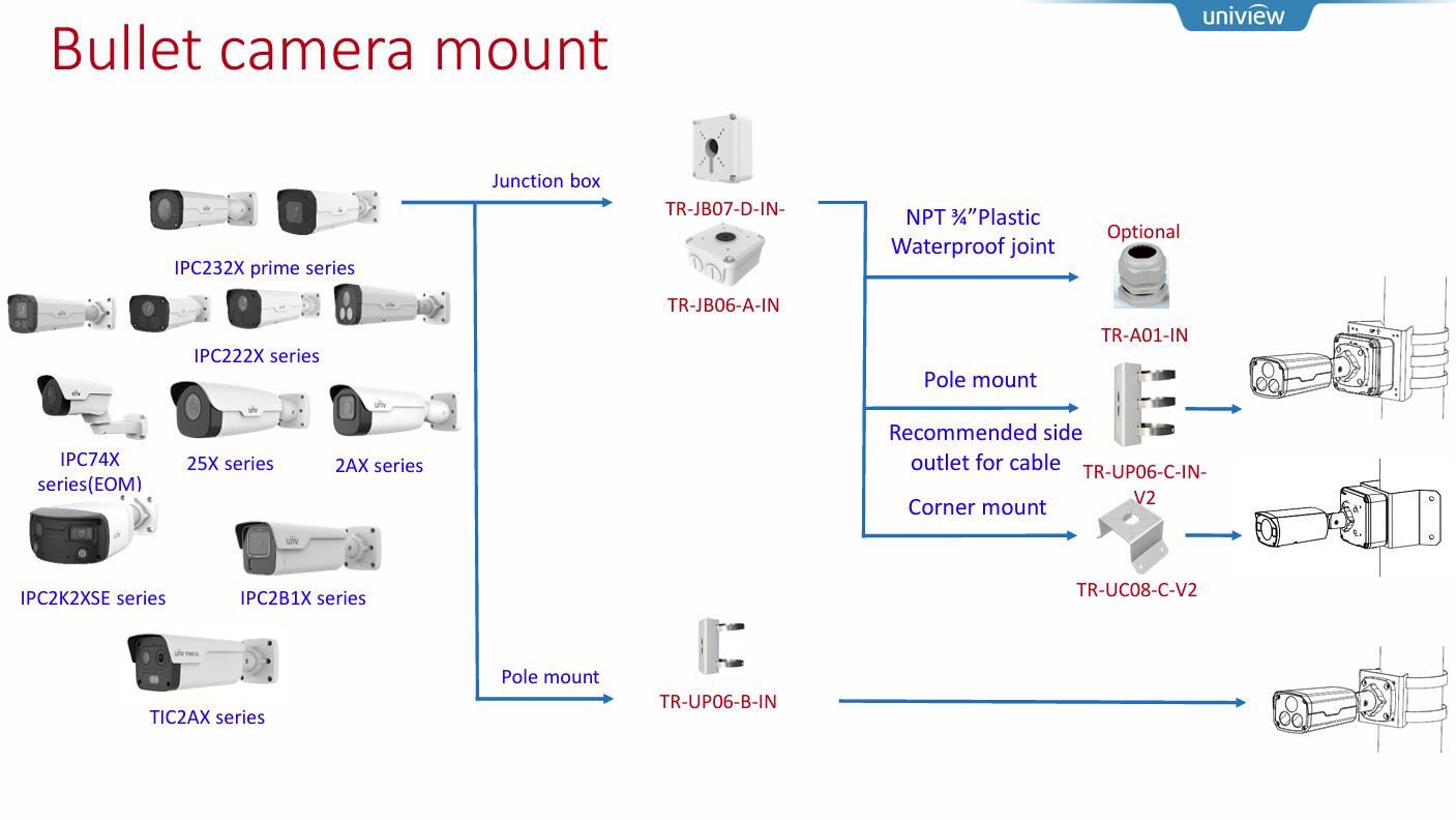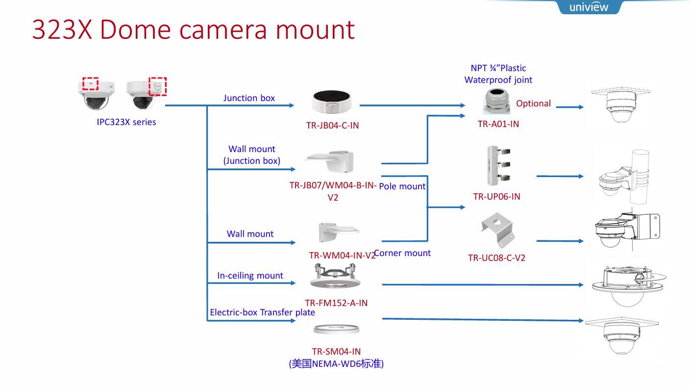 Skal du bruge beslag eller adapter til et Uniview kamera, så kan du bruge denne guide, men husk også at du kan finde alle de beslag der passer til kameraet, ved at gå til produktets side og vælge fanen .PDF og så downloade datasheet, her står det på sidste side ????