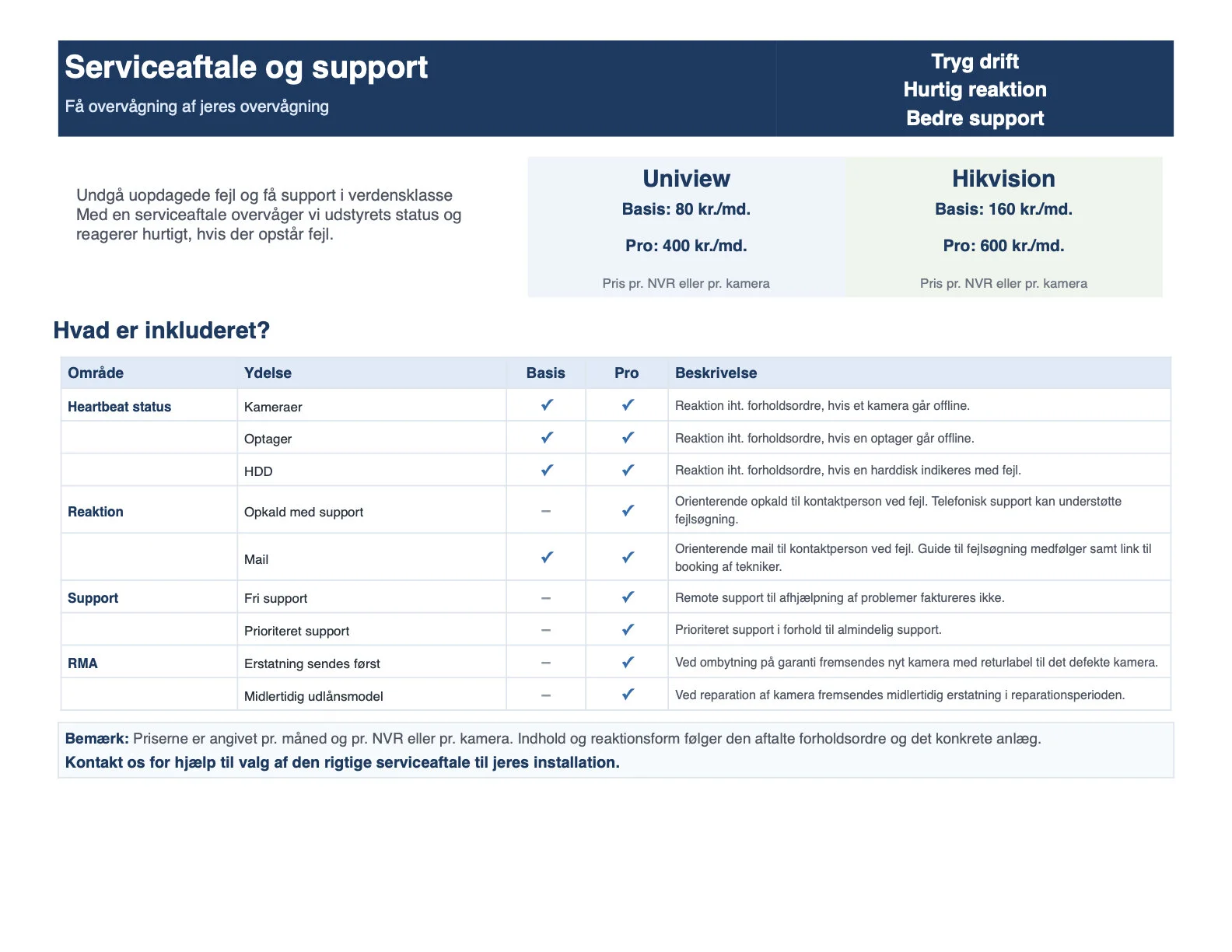 Basis serviceaftalen giver dig løbende overvågning af dit videoovervågningssystem, så fejl kan opdages i tide.